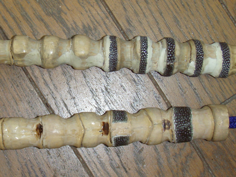 竹に溝を彫りそこに鮫皮を埋めて張っています。